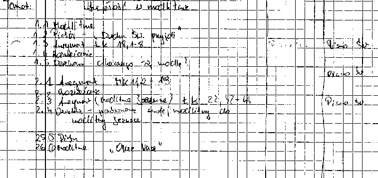 | Ewangeliczna rewizja życia (widzieć - osądzić - działać) | 1. | Żeby istotnie była to metoda ERŻ, należałoby bardziej stawiać pytania, a mniej w konspekcie udzielać od razu gotowych odpowiedzi. Zwłaszcza w ostatniej części "działać" wnioski powinny być bardziej wynikiem refleksji i osądu własnego życia uczestników, niż podpowiedziane przez animatora. | |